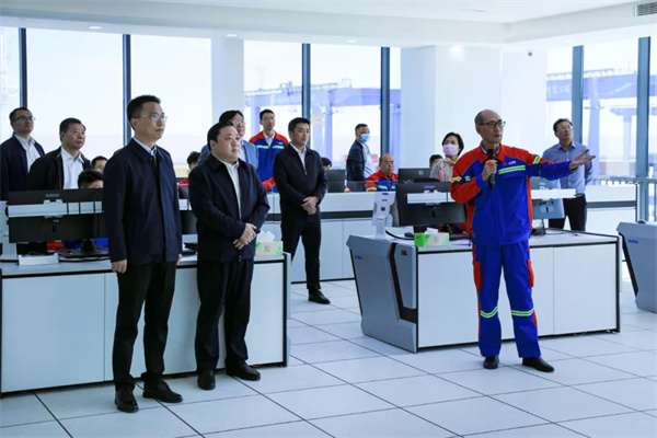 儀式結(jié)束后,與會領(lǐng)導(dǎo)還前往自動化集裝箱堆場指揮中心,詳細聽取現(xiàn)場操作講解,并觀摩堆場運營情況。