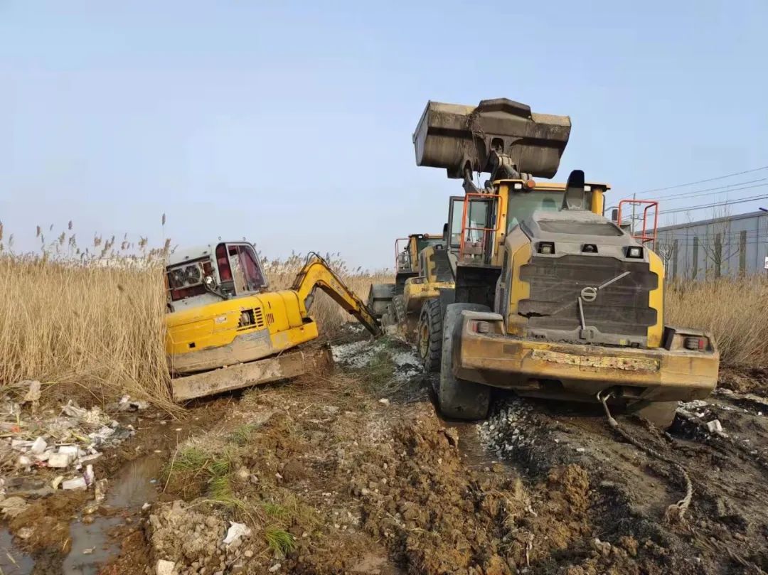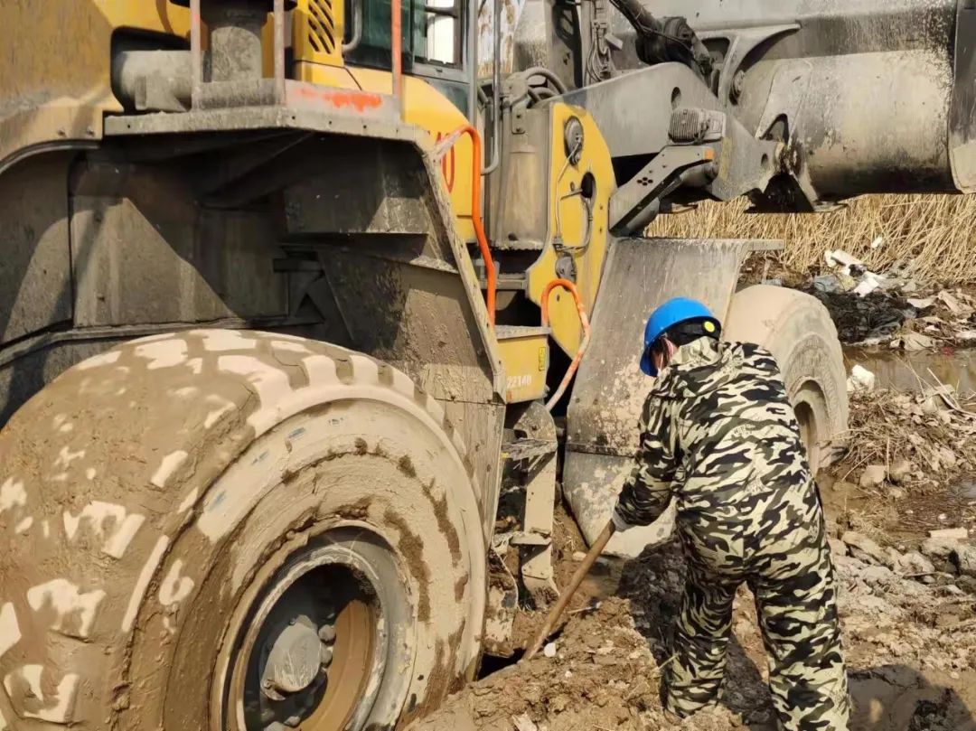 面對連續(xù)的失敗,響水港區(qū)團(tuán)隊(duì)再次展現(xiàn)出了百折不撓,迎難而上的港口工匠精神,深刻剖析前兩次失敗原因,再次調(diào)集一臺(tái)小型挖機(jī)對事件車輛輪子周邊淤泥進(jìn)行清理,回填石子提升其自身摩擦力,同時(shí)針對涉險(xiǎn)裝載機(jī)陷入太深可能造成底盤擱置等情況,調(diào)配一輛裝載機(jī)協(xié)助抬升予以解決,并再次調(diào)集一輛裝載機(jī)采用接力模式增加牽引力。經(jīng)過多臺(tái)機(jī)械的通力配合,受困裝載機(jī)終于在拖拽中緩緩駛出泥潭,圓滿完成救援工作。