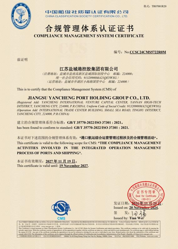 合規管理專業化水平穩步攀升。增設合規管理委員會、總法律顧問、首席合規官,發布《集團依法治企合規管理三年行動計劃(2023-2025)》,重點任務全部圓滿收官。憑借持續深耕,集團成功斬獲省內港口行業首張合規管理體系認證證書,下屬射陽港集團、濱海港集團、航運集團緊隨其后通過認證,合規管理水平躋身行業前列。