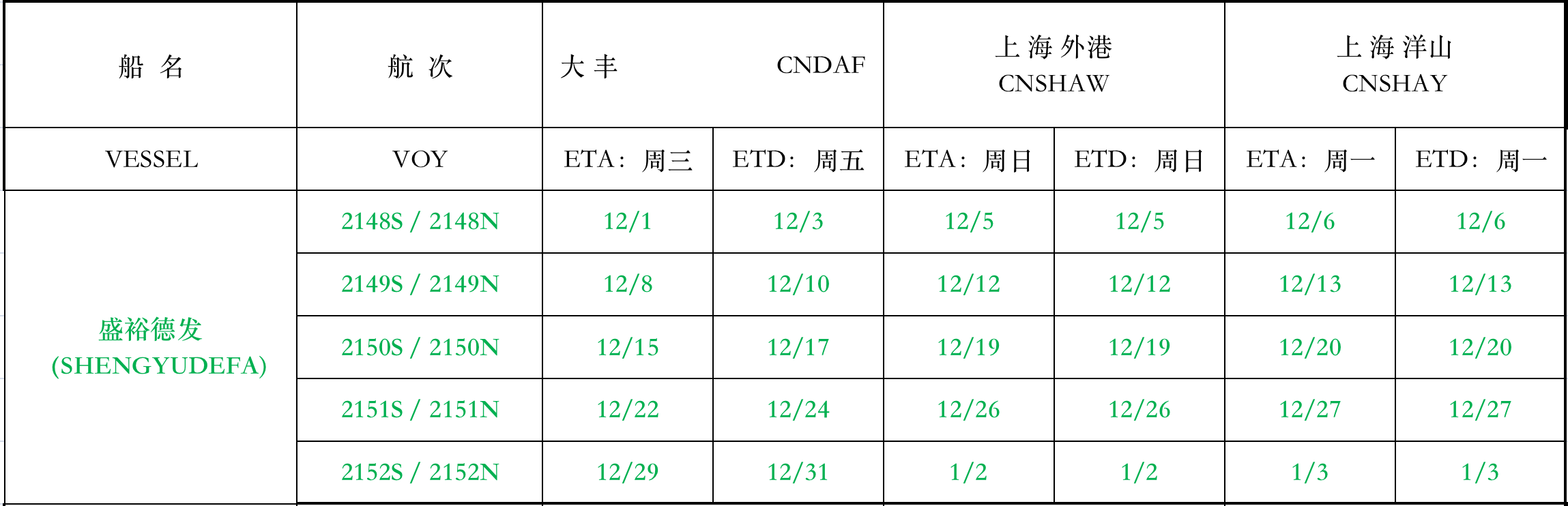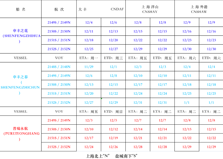 滬鹽專線2021年12月份沿海線船期表
