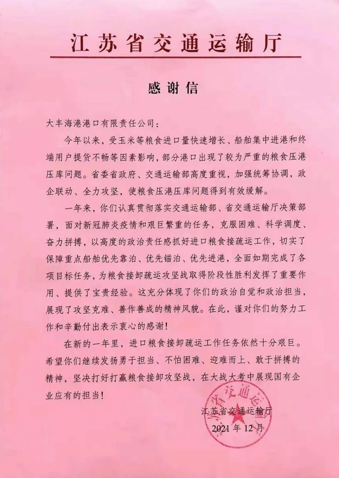 12月21日,省交通運輸廳向集團下屬港口公司發(fā)來感謝信,對港口公司面對新冠肺炎疫情和艱巨繁重的任務,克服困難、科學調(diào)度,努力抓好進口糧食接疏運工作,以及廣大干部職工的努力工作和辛勤付出表示感謝。