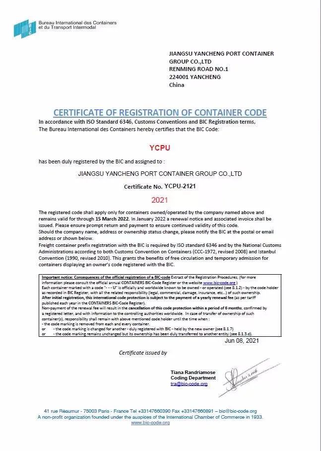 鹽城港集團(tuán)集裝箱自備箱全部獲得國(guó)際集裝箱局(法國(guó))登記認(rèn)證,正式成為可以全球流通的集裝箱