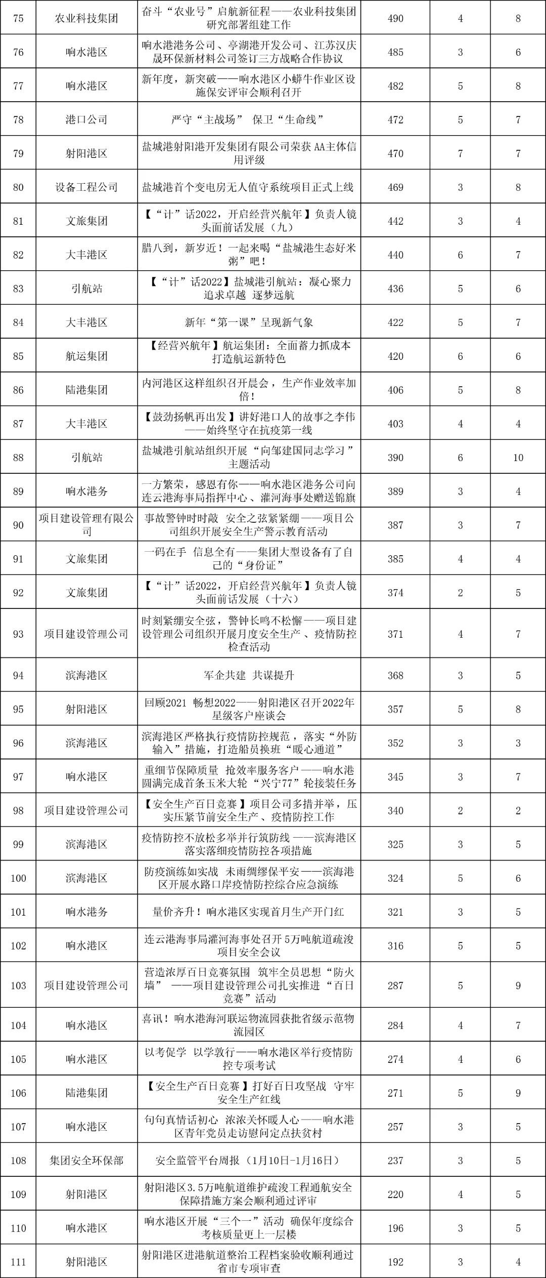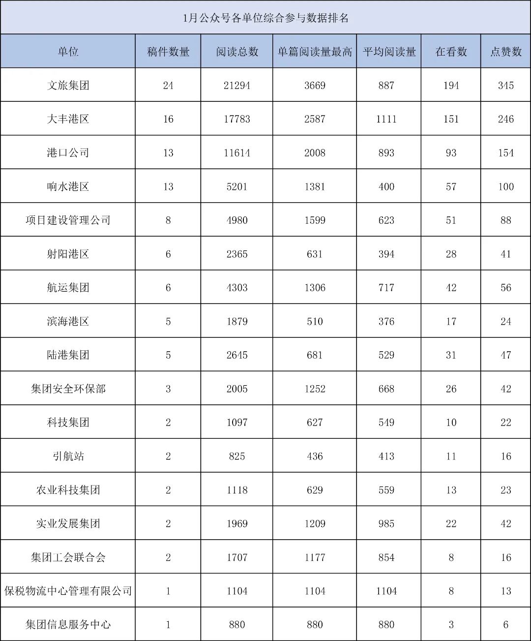 1月,“江蘇鹽城港控股集團(tuán)”微信公眾號(hào)推送文章170篇,截至目前,閱讀總量14萬(wàn)+,各單位供稿111篇。其中,文旅集團(tuán)以2.1萬(wàn)閱讀數(shù),24篇稿件量,遙遙領(lǐng)先;大豐港區(qū)以1.8萬(wàn)閱讀數(shù),16篇稿件量,位列第二;港口公司、響水港區(qū)在供稿方面,以同樣13篇的數(shù)量并列第三,在閱讀量方面,港口公司以1.2萬(wàn)的數(shù)量,位列單項(xiàng)第三;其他港口及板塊集團(tuán)積極參與,踴躍投稿,情況較好。