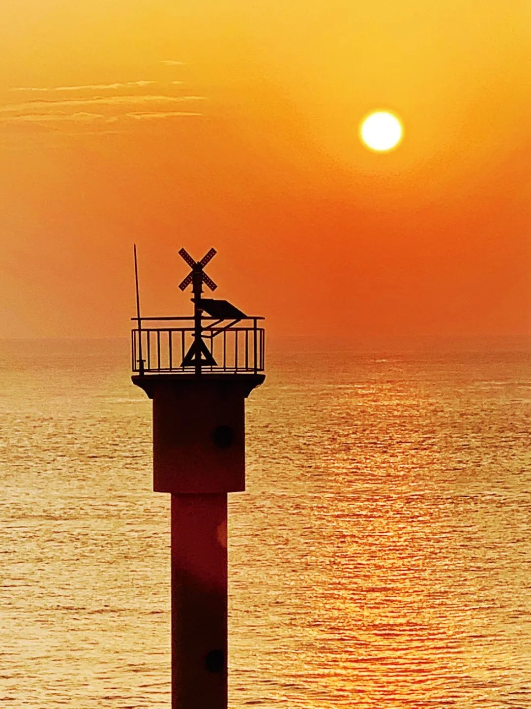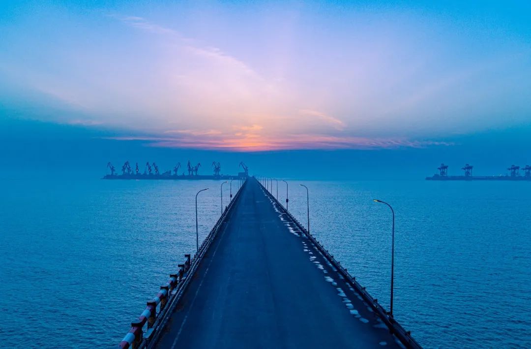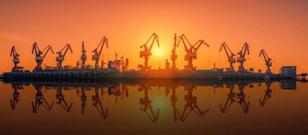 海平面上,太陽冉冉升起,映紅了海面和天空,照耀著海港的迷人和神奇,新興和璀璨。