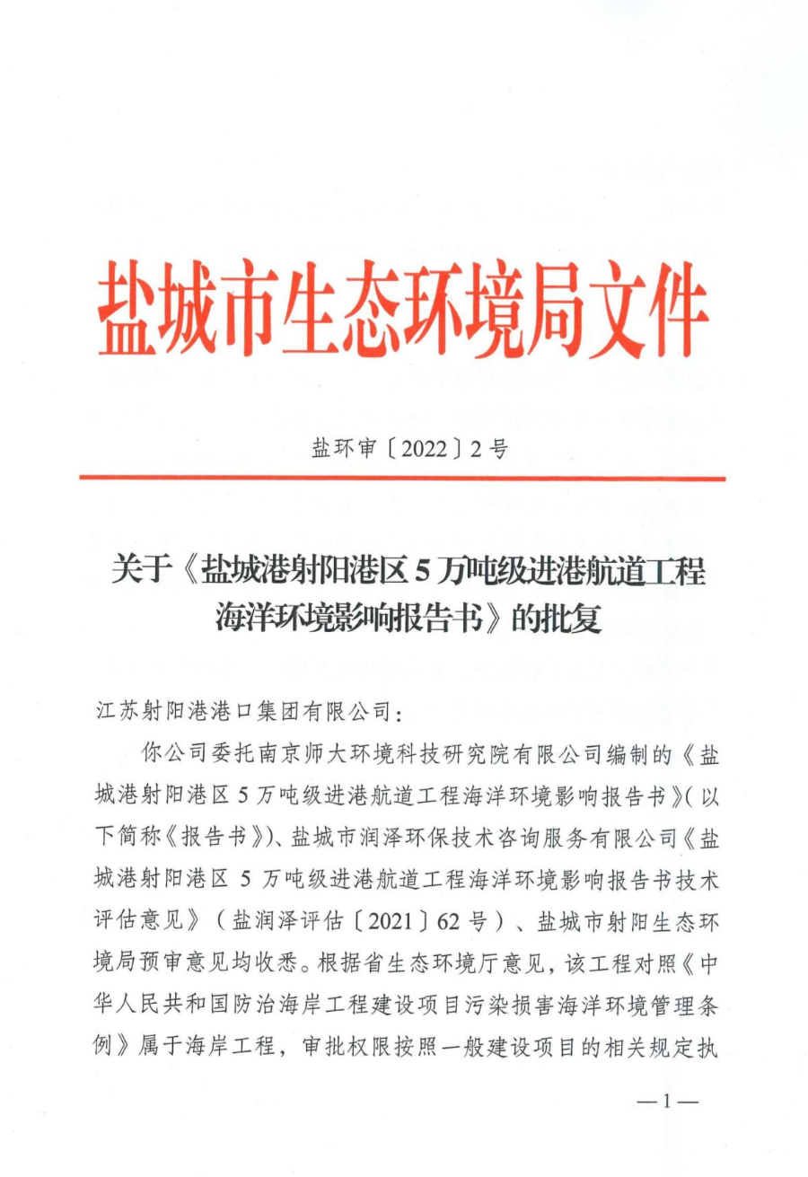 近日,鹽城港射陽港區(qū)5萬噸級進港航道項目海洋環(huán)評取得市生態(tài)環(huán)境局正式批復。至此,該項目已完成立項、用海預審、通航評估、安全預評價等十二項前期手續(xù),向項目的正式開工又邁進了堅實一步。