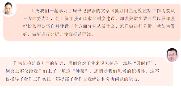 紀檢監(jiān)察業(yè)務(wù)周例會是大豐港區(qū)提高紀檢條線工作能力的方式,也是建設(shè)學習型紀檢干部的有效嘗試。“學習要有干貨,不能搞花架子,要了解我們的干部最需要學什么,緊貼實際需求和工作要求來安排學習內(nèi)容。”大豐港區(qū)紀檢相關(guān)負責人表示,深化監(jiān)察體制改革,對紀檢監(jiān)察干部的業(yè)務(wù)能力提出了更高更嚴的要求,學習就是要著力補短板、強弱項,解決紀檢監(jiān)察干部本領(lǐng)“恐慌”問題。例會上,就集團紀委下發(fā)文件精神進行剖析、對日常監(jiān)督如何抓、信息宣傳選題立意、特色亮點提煉歸納進行培訓。會上還提倡“我的問題大家答”,組織交流討論、現(xiàn)場解答,鼓勵善于發(fā)現(xiàn)問題,積極解決問題,創(chuàng)新理念思路,確保可以“充電補能”,提升業(yè)務(wù)能力。