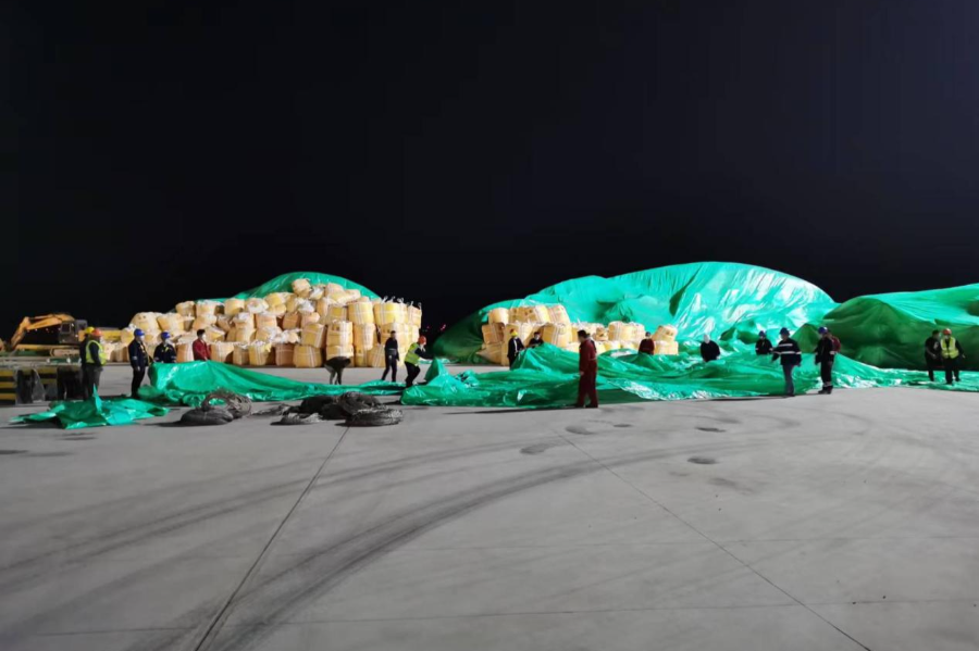 良好的服務是港口單位基業長青的基石所在,而良好的服務,就是要始終堅持想客戶所想、急客戶所急,始終把客戶的利益放在心中。4月22日,載重3000噸袋裝化肥“鴻錦祥”輪順利移泊至響水港6#泊位,該船貨物由客戶自行負責裝卸。由于該輪貨物后期需直接轉運至另一艘大輪,考慮到作業成本,經和我司協商后,客戶將相關貨物臨時堆放在了6#泊位碼頭面。4月26日下午16:00,“鴻錦祥”全船作業順利結束,而此時響水縣氣象局發布次日暴雨黃色預警,由于堆貨量較多,客戶自備的防雨布無法滿足碼頭現場貨物苫蓋,由于袋裝化肥相較于普通貨物,其貨品價值較高高,一旦雨淋受潮,貨物便會失去使用價值,給客戶造成無法挽回的損失。