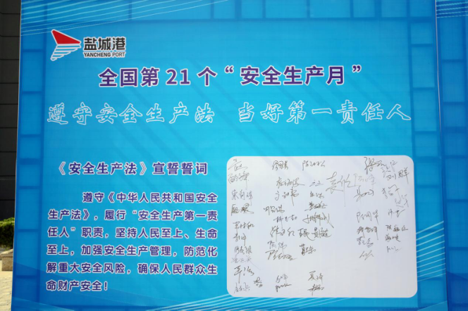 今年6月是全國第21個、全省第29個“安全生產月”,主題是“遵守安全生產法、當好第一責任人”。為促進安全生產形勢持續穩定向好,保障鹽城港集團“經營興航年”各項目標指標順利完成,按照鹽城港集團統一部署,6月2日,大豐港區舉行2022年安全生產月宣誓承諾活動。大豐港區各二級公司班子成員及安全條線人員參加。