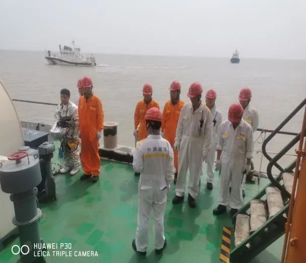 隨后,溢油演習正式開始,“左舷船中錨機壓管漏油啦!”“新海鯉”輪船長接報后立即拉響了防油污警報,同時船長通過全船廣播告知溢油地點,根據(jù)應變部署要求,立即切斷漏油源頭,控制油污流入海面,清理甲板現(xiàn)場污油。同時上報施工項目部,項目部組織“航工301”、“茸洋168”、“海盛189”輪立即趕赴灌河口航道轉(zhuǎn)運點參與新海鯉輪的水面油污清理工作,通過各輪齊心協(xié)作,成功完成清污工作。