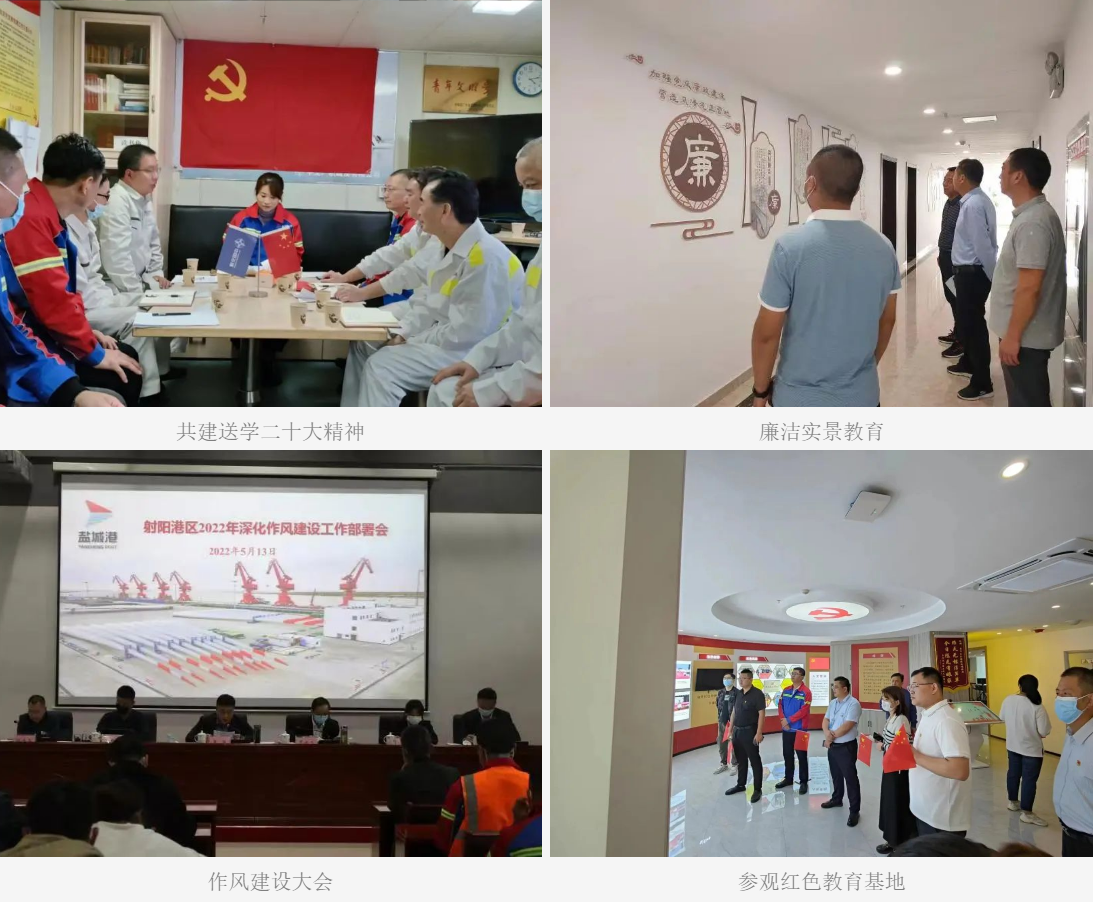 亮實招,扛起責任,挺紀在前拉起廉潔防線。射陽港區黨總支專題研究黨風廉政建設工作,制定《2022年全面從嚴治黨主體責任清單》,逐級簽訂黨風廉政建設責任書,一級抓一級,層層落實責任;召開黨風廉政建設工作大會、警示教育大會、書記上廉政專題黨課,組織赴廉政教育基地接受實境教育,開展廉政專項談話,主要領導逢會必講廉潔,常態化學習教育時刻警醒全體員工知敬畏、守底線。