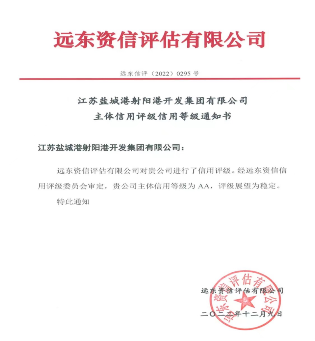 近期,經(jīng)遠東資信信用評級委員會審定,江蘇鹽城港射陽港開發(fā)集團有限公司成功獲得AA級主體信用評級,評級展望為穩(wěn)定。