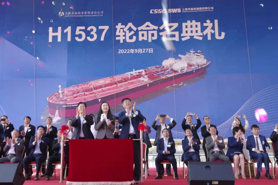9月27日,交銀金租與外高橋造船合作新造的H1537號LR2型油輪命名交付。本項目訂造的LR2型成品油輪是目前全球最大的成品油運輸船只,是外高橋在大型油輪建造領域的又一重要成果,代表了當前世界上成品油輪建造的最高水平,得到了國際一流貨主殼牌石油和國際頭部船級社的一致認可。