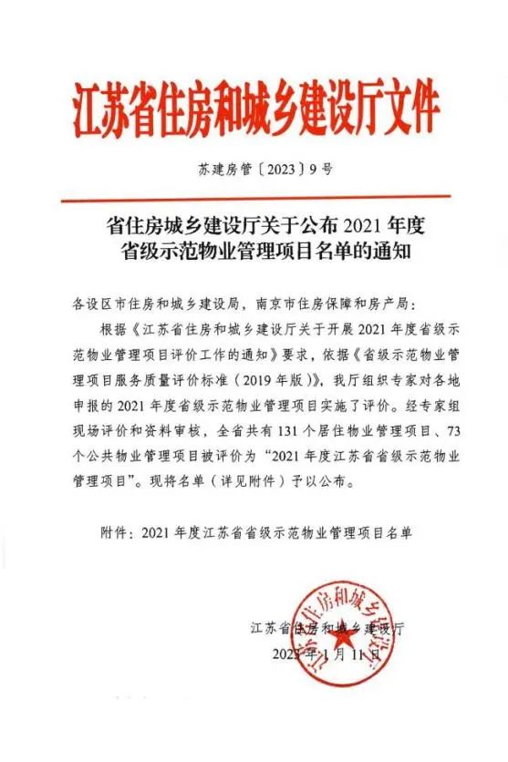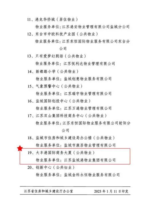 近日,江蘇省住房和城鄉建設廳公布2021年度省級示范物業管理項目名單,“鹽城港大豐港國際商務大廈(公共物業)”被評價為“2021年度省級示范物業管理項目”,該項目由鹽城港物業集團有限公司提供管理服務,該榮譽是江蘇省物業管理行業省級最高榮譽。