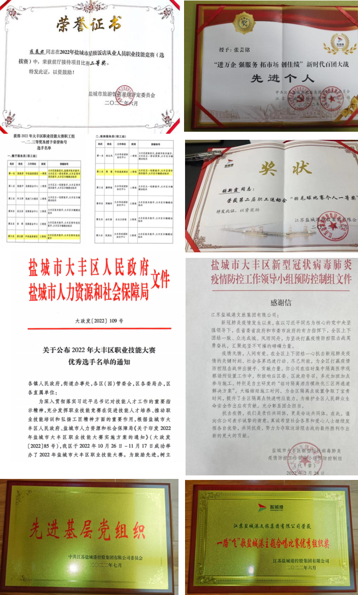 2022年,文旅集團黨總支和港泊半島酒店支部被評為“先進基層黨組織”。文旅集團洪兵、韓世軍在鹽城港集團“七一”表彰中獲評優(yōu)秀共產(chǎn)黨員稱號,蔣雷獲評優(yōu)秀共青團員稱號。港泊半島酒店職工張曉芳、湯以新、蔣慧等同志分別獲得大豐區(qū)技能狀元、鹽城市技術(shù)能手、大豐區(qū)五一勞動獎?wù)隆⒋筘S區(qū)青年崗位能手、大豐區(qū)巾幗建功標兵稱號。