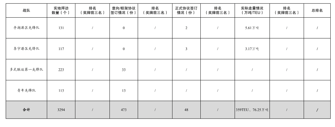 2.簽訂意向/框架協議數量473份:其中大豐港區先鋒隊96份,航運集團先鋒隊76份,黨員先鋒隊55份,巾幗先鋒隊51份,濱海港區先鋒隊46份,多式聯運第二先鋒隊45份,多式聯運第一先鋒隊33份,射陽港區先鋒隊23份,響水港區先鋒隊23份,青年先鋒隊13份,建湖港區先鋒隊12份。