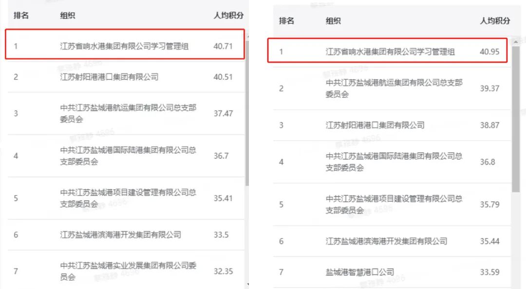 響水港集團學(xué)習(xí)組學(xué)習(xí)強國積分人均41分左右,連續(xù)多日排名集團系統(tǒng)學(xué)習(xí)組第一。