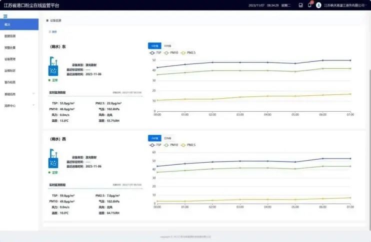 基于激光散射的監(jiān)測(cè)設(shè)備和江蘇省港口粉塵在線監(jiān)管系統(tǒng)上線后,通過(guò)碼頭東側(cè)和西側(cè)的2個(gè)揚(yáng)塵在線監(jiān)測(cè)儀,能掃描整個(gè)散貨作業(yè)碼頭,實(shí)時(shí)獲得碼頭作業(yè)區(qū)的PM2.5、PM10、TSP總懸浮顆粒物濃度數(shù)據(jù),實(shí)現(xiàn)碼頭全域100%監(jiān)測(cè)全覆蓋。