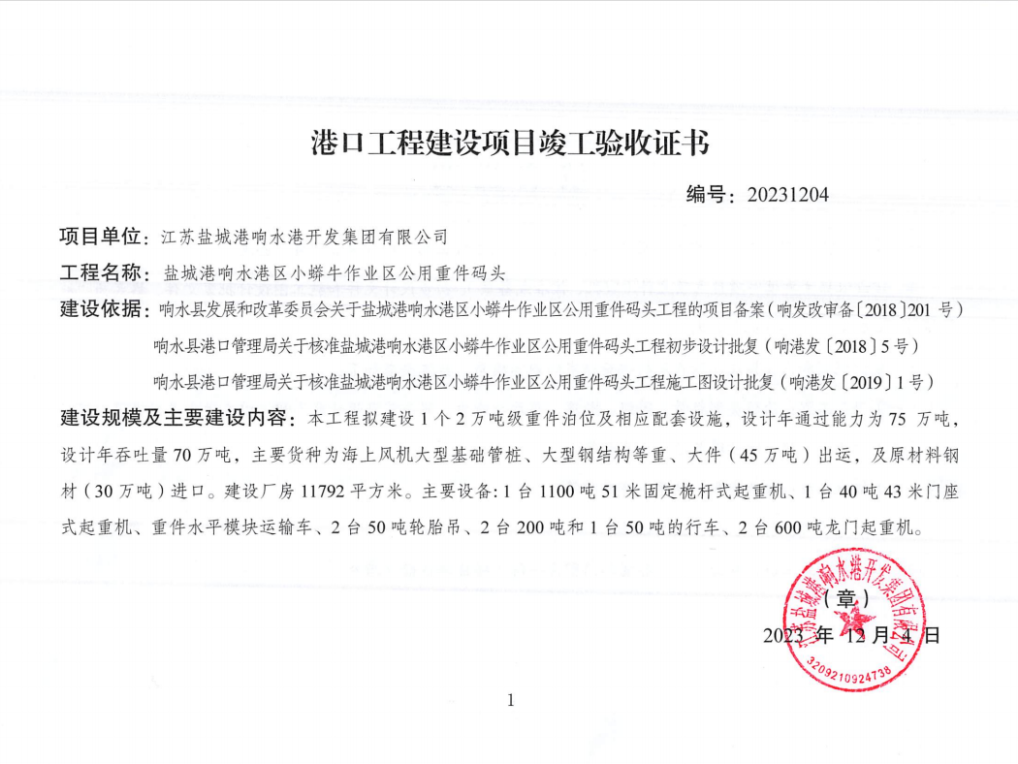 本工程位建設(shè)1個(gè)2萬(wàn)噸級(jí)重件泊位(水工結(jié)構(gòu)兼顧5萬(wàn)噸級(jí)船舶)及相應(yīng)配套設(shè)施,碼頭前沿設(shè)置一臺(tái)最大起吊能力達(dá)1200噸的固定桅桿式起重機(jī),是目前江蘇沿海港口起吊能力最大的專用重件碼頭。碼頭功能定位為以風(fēng)電重、大件貨物為主,兼顧鋼材等件雜貨,設(shè)計(jì)年通過(guò)能力75萬(wàn)噸。此次竣工驗(yàn)收現(xiàn)場(chǎng)核查組由連云港海事局灌河海事處、連云港海事局響水海事大隊(duì)、鹽城市交通運(yùn)輸局、鹽城市交通運(yùn)輸綜合行政執(zhí)法支隊(duì)、響水縣交通運(yùn)輸局、鹽城市響水工業(yè)經(jīng)濟(jì)區(qū)管委會(huì)等相關(guān)部門(mén)代表及5名特邀專家組成。在驗(yàn)收會(huì)上,核查組認(rèn)真聽(tīng)取了項(xiàng)目參建單位的匯報(bào),對(duì)工程實(shí)體建設(shè)情況做出了綜合評(píng)價(jià),經(jīng)會(huì)議討論,一致同意該工程通過(guò)竣工驗(yàn)收。