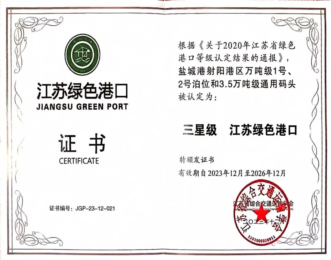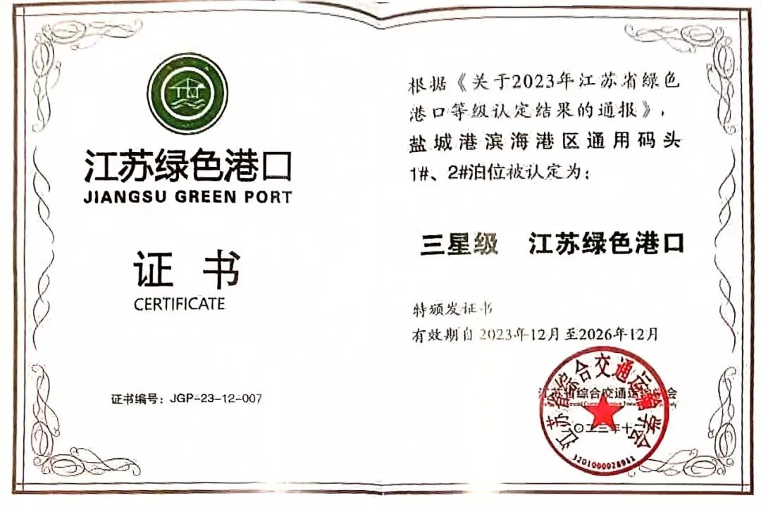 濱海港區獲得“江蘇省三星級綠色港口”榮譽稱號