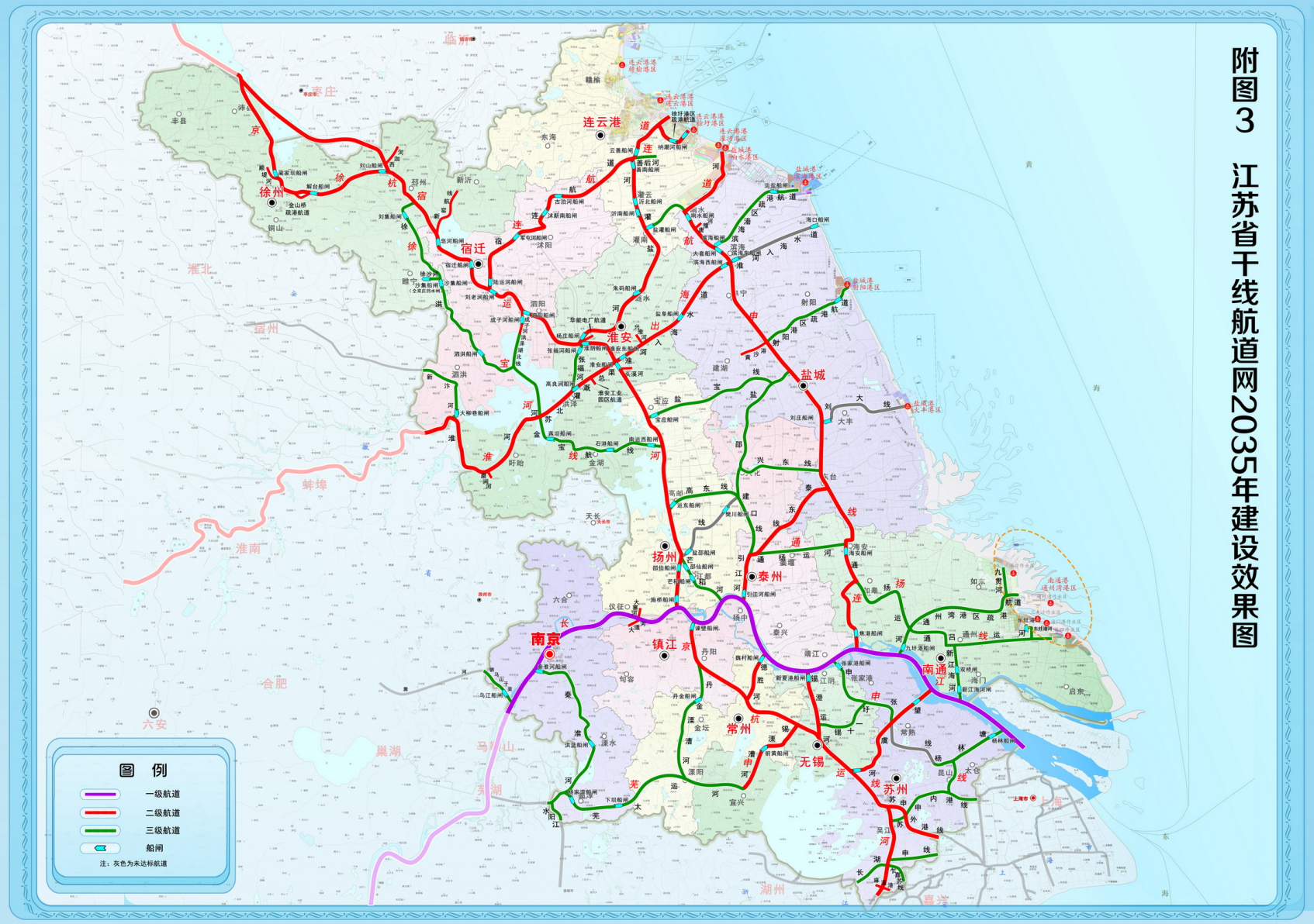 《規劃》明確,至2035年,全省干線航道網規劃總里程4192公里,總體呈現“兩縱五橫”的布局形態,形成以長江干線、京杭運河、淮河國家水運主通道為核心,二級及以上航道為主體、三級航道為支撐的“聯網暢通、達海通江、優質高效、保障有力”的干線航道網絡。