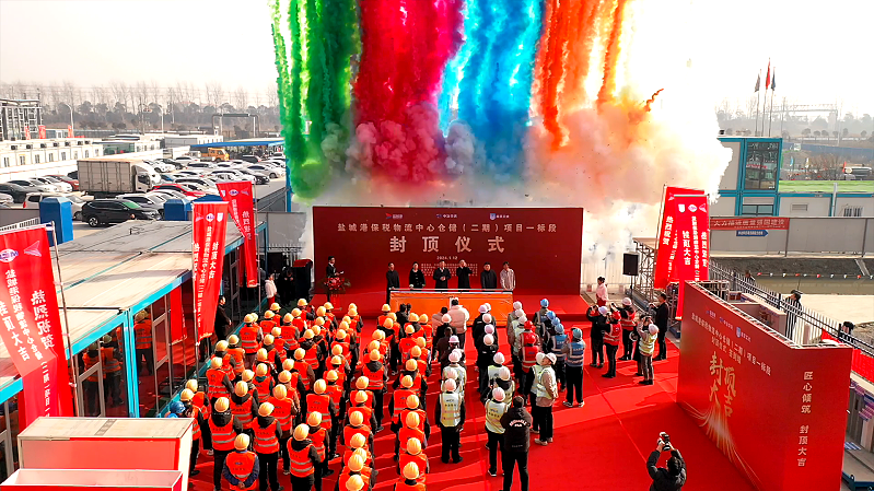 1月12日上午,鹽城港保稅物流中心在建項目倉儲(二期)一標段C1、C2倉庫迎來主體封頂的喜慶日子,為項目2024年順利竣工奠定了基礎。