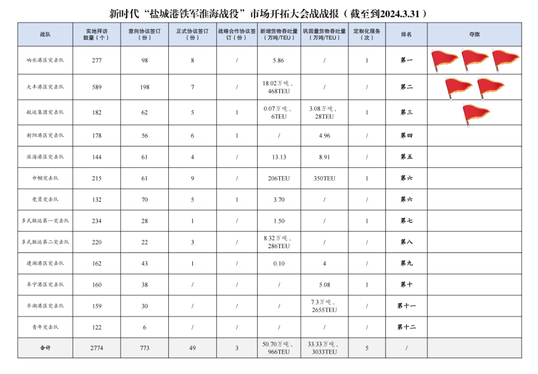2.簽訂意向協(xié)議數(shù)量773份:其中大豐港區(qū)突擊隊198份,響水港區(qū)突擊隊98份,黨員突擊隊70份,航運集團突擊隊62份,巾幗突擊隊61份,濱海港區(qū)突擊隊61份,射陽港區(qū)突擊隊56份,建湖港區(qū)突擊隊43份,阜寧港區(qū)突擊隊38份,亭湖港區(qū)突擊隊30份,多式聯(lián)運第一突擊隊28份,多式聯(lián)運第二突擊隊22份,青年突擊隊6份。