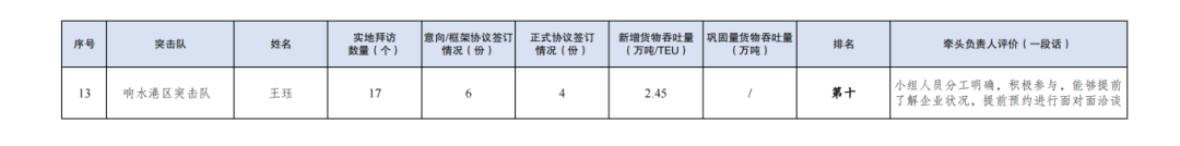 第一名:巾幗突擊隊 李婷婷(拜訪客戶149家,簽訂意向協(xié)議42份,簽訂正式協(xié)議5份,新增貨物吞吐量48TEU,鞏固量貨物吞吐量68TEU)