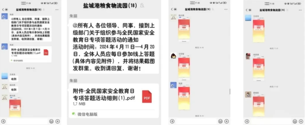 線上利用公司微信群、黨員學(xué)習(xí)微信群發(fā)送學(xué)習(xí)資料,全方位、多角度宣傳國(guó)家安全知識(shí),進(jìn)一步增強(qiáng)“國(guó)家安全無(wú)小事”的觀念和意識(shí)。