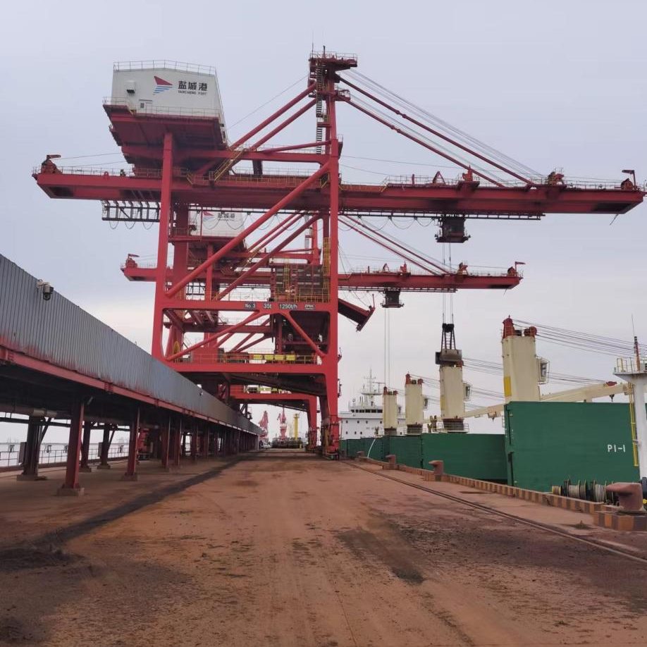 橋式抓斗卸船機(jī)簡(jiǎn)稱卸船機(jī),是目前專業(yè)化散貨碼頭最常見的也是效率最高的裝卸船設(shè)備,橋式抓斗卸船機(jī)可在軌道上運(yùn)行,門架下凈空高度可通運(yùn)輸車輛,抓斗由船上抓散煤后,卸至錐形料斗。通過料斗出料口送至碼頭上的皮帶輸送機(jī),然后送至堆場(chǎng),目前大豐港擁有4臺(tái)全流程卸船機(jī)。