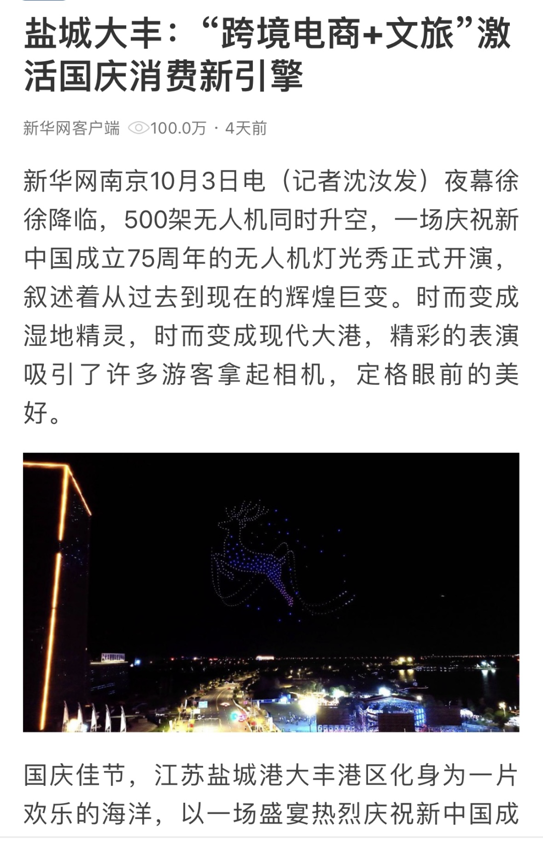 音樂盛宴、“跨境電商+文旅”、無人機表演……為期七天的國慶黃金周火爆落幕,鹽城港以其獨特的魅力吸引了無數游客的目光,文旅產業持續升溫,游客消費熱情高漲,傳遞著假日經濟的強勁“脈動”。