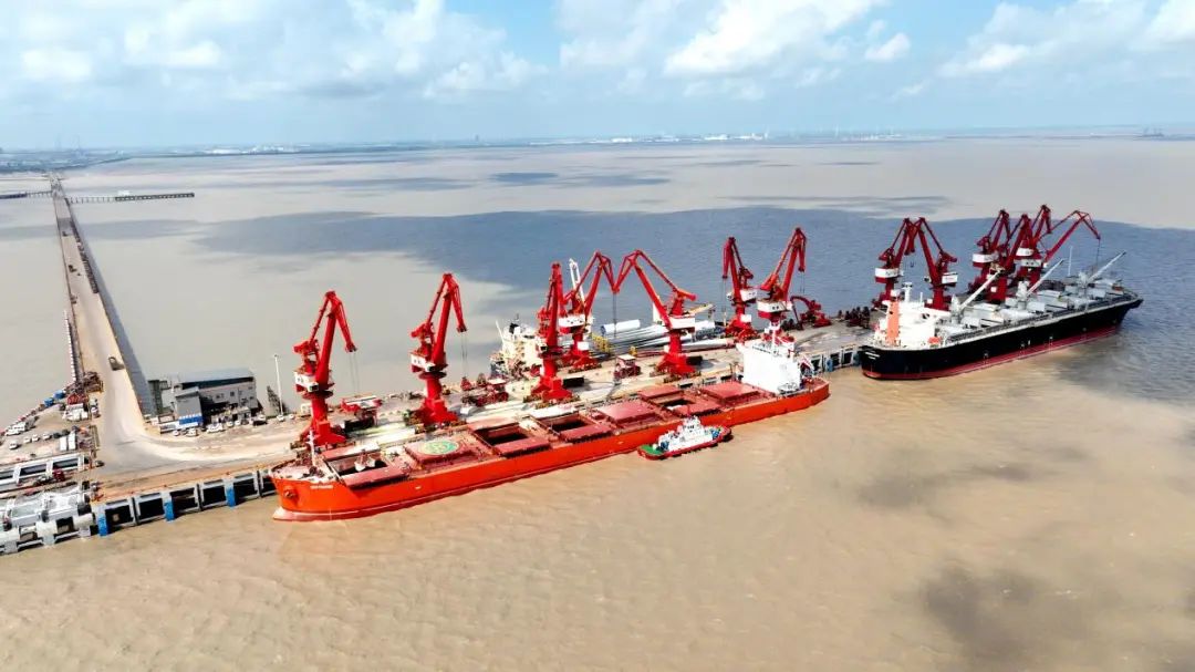 堆場上,堆積如山的集裝箱在秋陽的映照下,閃耀著迷人的光澤。碼頭門機忙碌地吊運著,與秋天的寧靜形成了鮮明的對比。