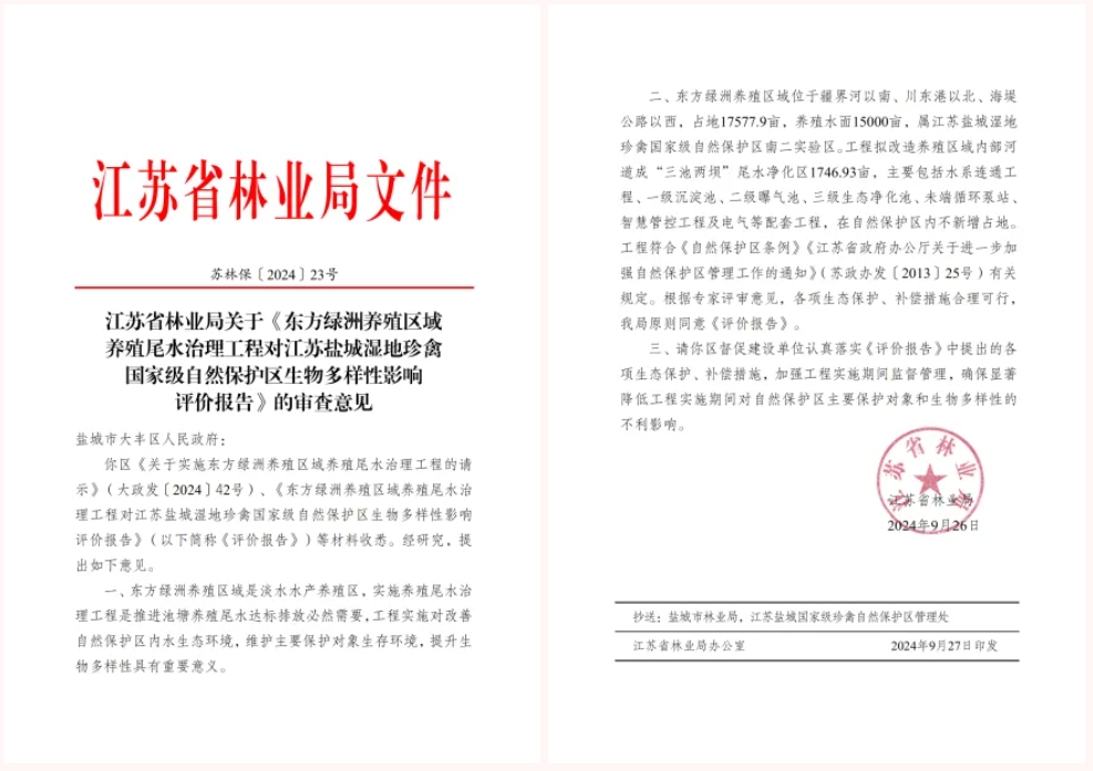 近日,江蘇省林業(yè)局發(fā)布關(guān)于《東方綠洲養(yǎng)殖區(qū)域養(yǎng)殖尾水治理工程對(duì)江蘇鹽城濕地珍禽國(guó)家級(jí)自然保護(hù)區(qū)生物多樣性影響評(píng)價(jià)報(bào)告》的審查意見(jiàn),充分肯定了農(nóng)業(yè)科技集團(tuán)養(yǎng)殖尾水治理項(xiàng)目在改善自然保護(hù)區(qū)內(nèi)水生態(tài)環(huán)境、維護(hù)主要保護(hù)對(duì)象生存環(huán)境以及提升生物多樣性的重要意義,并同意項(xiàng)目實(shí)施。