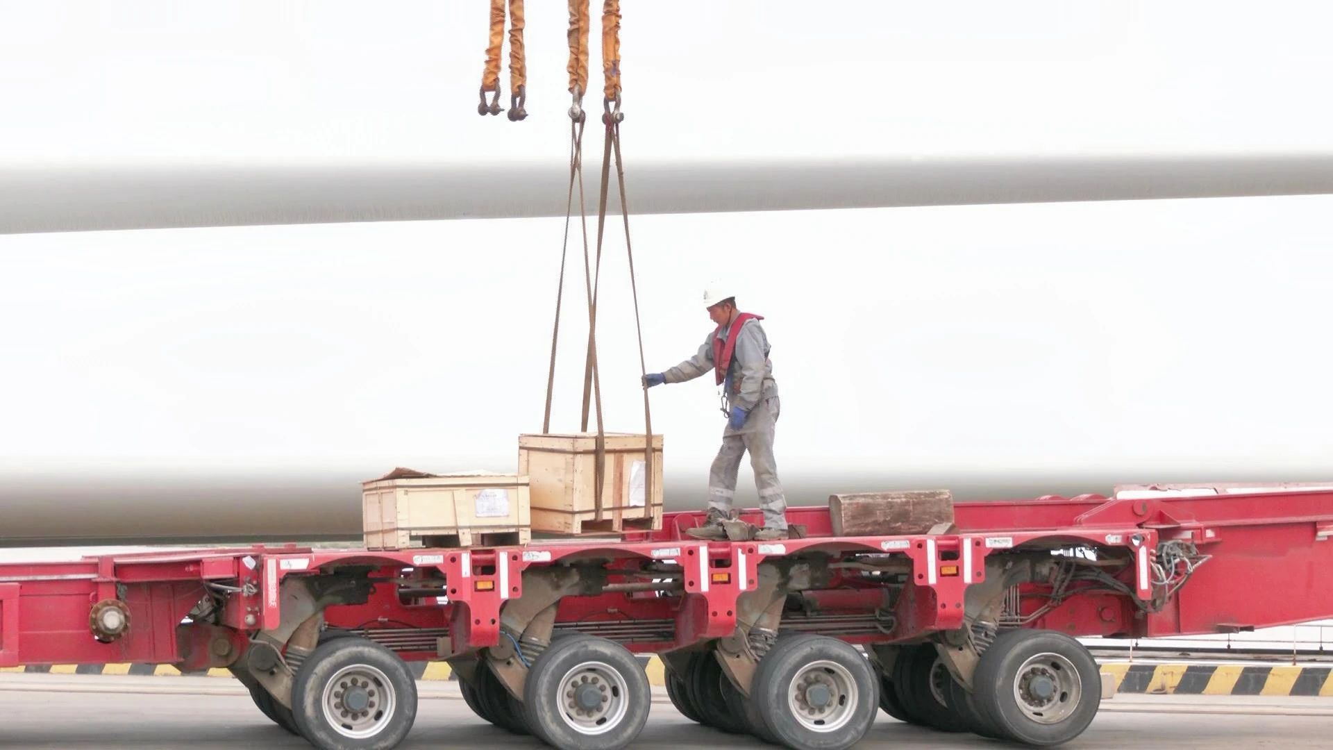 日前,記者走進鹽城港射陽港區,多輛大件運輸車正將風電葉片運往碼頭。在吊鉤固定完成后,操作人員操控起重機將葉片及配套工裝緩緩吊運至貨輪,并精準安放在指定位置?,F場作業人員全神貫注,確保每片葉片都能安全、準確地完成裝載,整個碼頭呈現出一派熱火朝天的作業景象。