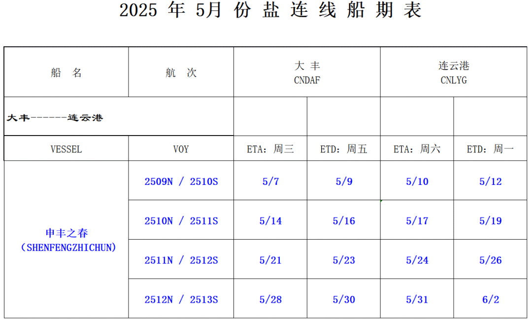 “滬鹽專線”承擔著鹽城港大豐港區至上海港洋山、外高橋的集裝箱進出口內外貿同船內支線業務,由5艘船舶參與運營并構建起穩定的運輸力量。一般情況下,“滬鹽”航次的標準航期為5-6天,作為鹽城地區唯一內支線,目前已實現“天天班”運營。“鹽連支線”作為積極響應省委省政府“水運江蘇”戰略部署、緊密串聯沿海關鍵節點的重要航線,由1艘自有船舶承擔運營,該航線規劃每周執行一次航次,同時具備根據實際貨運需求靈活調整航次的能力,增加運營船舶,以確保運輸效率與服務質量的雙重提升。