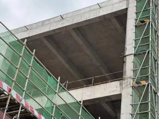 混凝土結(jié)構(gòu)施工區(qū)域,淺棕色木方違規(guī)傾斜堆放于臨邊圍擋處,遇外力(如碰撞、大風)易發(fā)生墜落,威脅下方作業(yè)人員安全。