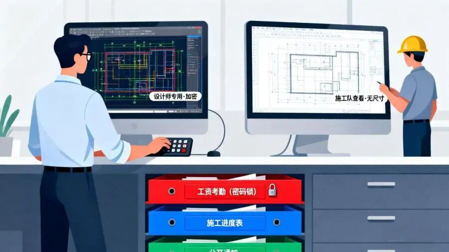資料分好“保密等級”:重要的圖紙別誰都能看,比如只有設(shè)計師能打開帶尺寸的詳細(xì)圖,施工隊看簡化版就行;工人的考勤數(shù)據(jù)、工資信息單獨存,設(shè)密碼鎖,別和施工進(jìn)度表混在一起。