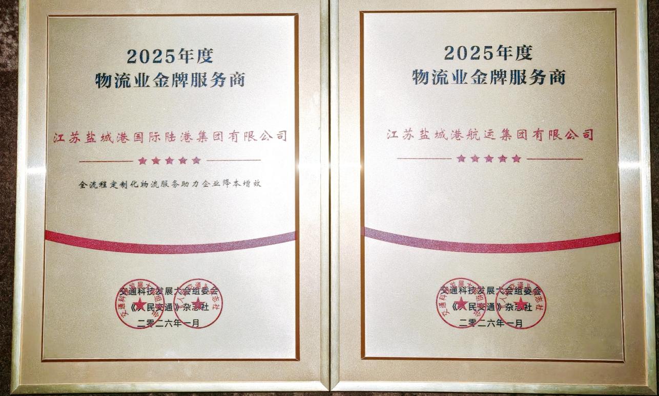 近日,在青島舉辦的第六屆中國交通科技發展大會上,鹽城港陸港集團、航運集團憑借各自的“全流程定制化物流服務”創新模式和“綠色智慧賦能多式聯運高質量發展”特色實踐,雙雙榮獲2025年度全國物流業金牌服務商稱號。