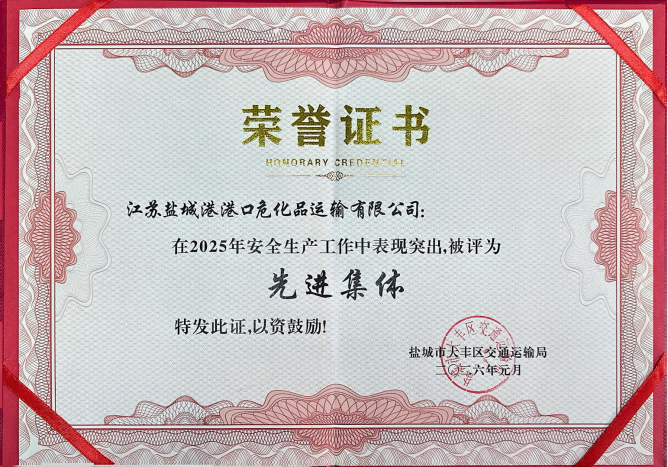 近日,鹽城港港口?;愤\輸有限公司憑借扎實有效的安全生產管理工作、突出的安全風險防控成效,榮獲大豐區交通局授予的“2025年安全生產工作先進集體”榮譽稱號,用責任與擔當樹立了?;沸袠I安全規范經營的標桿。
