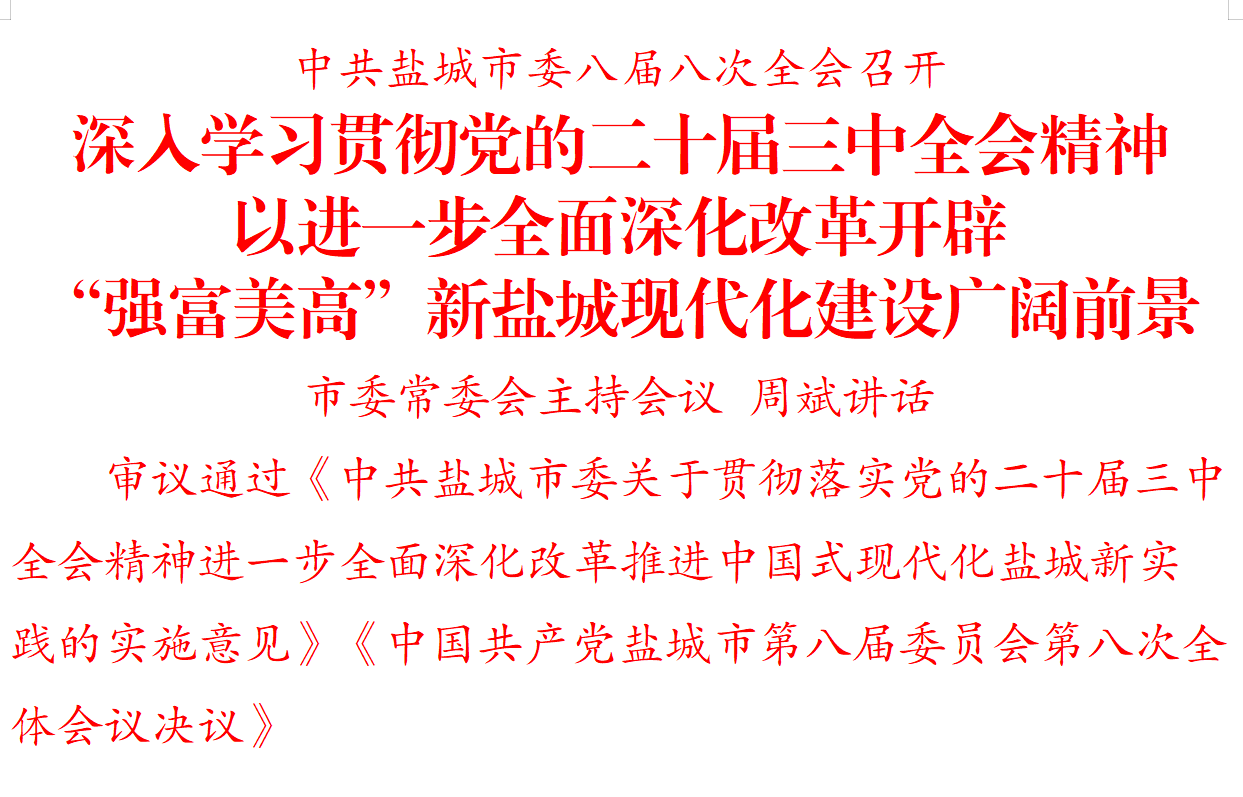 全會審議通過《中共鹽城市委關于貫徹落實黨的二十屆三中全會精神進一步全面深化改革推進中國式現代化鹽城新實踐的實施意見》《中國共產黨鹽城市第八屆委員會第八次全體會議決議》。
