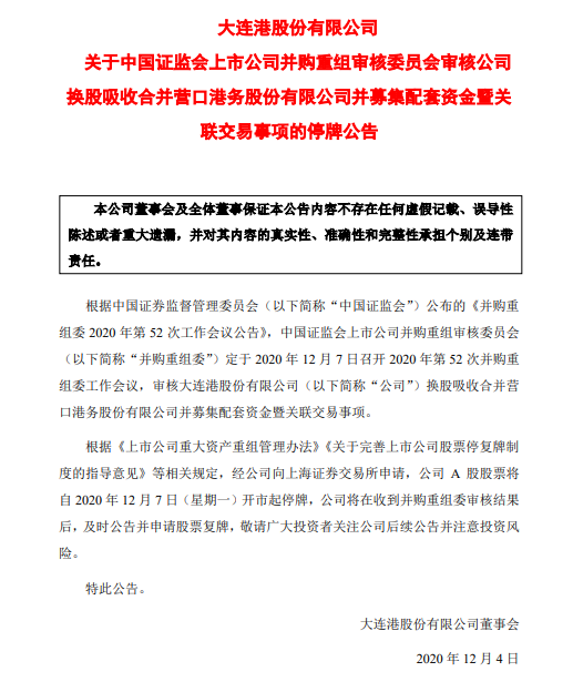 大連港與營口港發布公告表示,根據中國證券監督管理委員會公布的《并購重組委2020年第52次工作會議公告》,中國證監會上市公司并購重組審核委員會定于2020年12月7日召開2020年第52次并購重組委工作會議,審核大連港股份有限公司換股吸收合并營口港務股份有限公司并募集配套資金暨關聯交易事項。經公司向上海證券交易所申請,公司股票將自2020年12月7日(今日)開市起停牌,公司將在收到并購重組委審核結果后,及時公告并申請股票復牌。